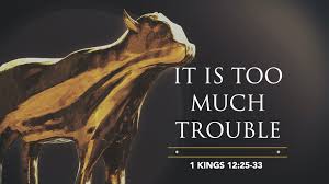 28 After seeking advice, the king made two golden calves. He said to the people, “It is too much for you to go up to Jerusalem. Here are your gods, Israel, who brought you up out of Egypt.” 29 One he set up in Bethel, and the other in Dan. 30 And this thing became a sin; the people came to worship the one at Bethel and went as far as Dan to worship the other.