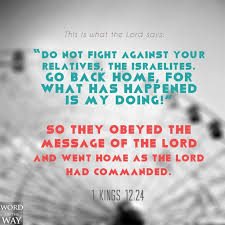 22 But this word of God came to Shemaiah the man of God: 23 “Say to Rehoboam son of Solomon king of Judah, to all Judah and Benjamin, and to the rest of the people, 24 ‘This is what the Lord says: Do not go up to fight against your brothers, the Israelites. Go home, every one of you, for this is my doing.’” So they obeyed the word of the Lord and went home again, as the Lord had ordered.