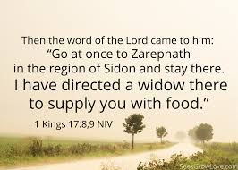 7 Some time later the brook dried up because there had been no rain in the land. 8 Then the word of the Lord came to him: 9 “Go at once to Zarephath in the region of Sidon and stay there. I have directed a widow there to supply you with food.” 10 So he went to Zarephath. When he came to the town gate, a widow was there gathering sticks. He called to her and asked, “Would you bring me a little water in a jar so I may have a drink?” 11 As she was going to get it, he called, “And bring me, please, a piece of bread.”