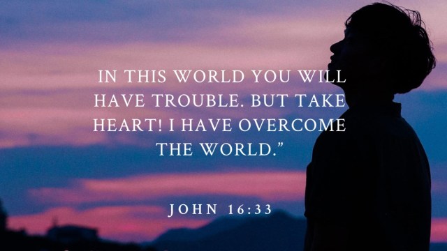 “I have told you these things, so that in me you may have peace. In this world you will have trouble. But take heart! I have overcome the world.”—Jesus, John 16:33