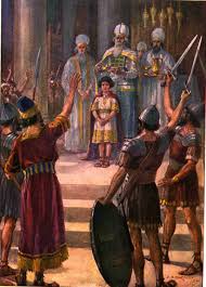 Now, imagine a seven-year-old like yourself, being told one day to come to the Temple of the Lord to be anointed as King of Israel! What are your thoughts, now? Evil is replaced by God with the innocence of a boy who becomes a king. How will this work?