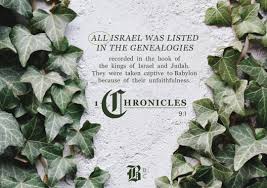 Chronicles is a great place to look for a name with meaning and significance! Names were not just plucked from previous family names it seems; but original names. What a father named his son was influenced by what was occurring in his life at the time of his son’s birth. Where, when, and how he was born “named” the son.