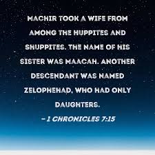 14 The descendants of Manasseh: Asriel was his descendant through his Aramean concubine. She gave birth to Makir the father of Gilead. 15 Makir took a wife from among the Huppites and Shuppites. His sister’s name was Maakah. Another descendant was named Zelophehad, who had only daughters. 16 Makir’s wife Maakah gave birth to a son and named him Peresh. His brother was named Sheresh, and his sons were Ulam and Rakem.