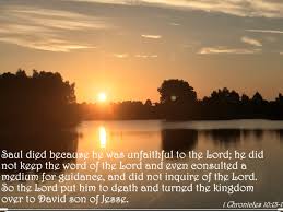 13 Saul died because he was unfaithful to the Lord; he did not keep the word of the Lord and even consulted a medium for guidance, 14 and did not inquire of the Lord. So the Lord put him to death and turned the kingdom over to David son of Jesse.