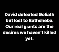 The heart of David who ran after the heart of God, with the confidence of God with him now followed his own heart that was overcome with selfish desire, lust, for another man’s wife with self-confidence, arrogance, and pride. Sin expands and leads to death. Our sin blocks our view of the God who overcomes and wants His best for us. David grieved the heart of God and His Holy Spriit. This giant addiction overcame the David’s heart.