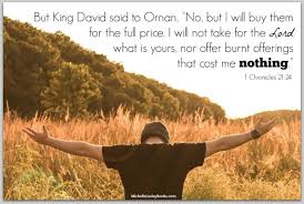 24 But King David replied to Araunah, “No, I insist on paying the full price. I will not take for the Lord what is yours, or sacrifice a burnt offering that costs me nothing.”