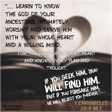 9 “And you, my son Solomon, acknowledge the God of your father, and serve him with wholehearted devotion and with a willing mind, for the Lord searches every heart and understands every desire and every thought. If you seek him, he will be found by you; but if you forsake him, he will reject you forever. 10 Consider now, for the Lord has chosen you to build a house as the sanctuary. Be strong and do the work.”