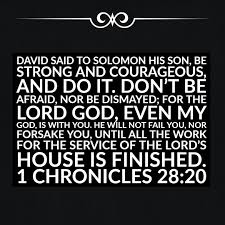 Before he died, King David told his son, Solomon; “Be strong and courageous, and do the work. Do not be afraid or discouraged, for the Lord God, my God, is with you. He will not fail you or forsake you until all the work for the service of the temple of the Lord is finished.” (1 Chronicles 28:20)