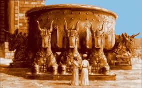 4 The Sea stood on twelve bulls, three facing north, three facing west, three facing south and three facing east. The Sea rested on top of them, and their hindquarters were toward the center. 5 It was a handbreadth in thickness, and its rim was like the rim of a cup, like a lily blossom. It held three thousand baths.