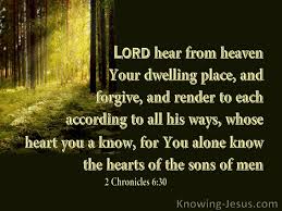 28 “When famine or plague comes to the land, or blight or mildew, locusts or grasshoppers, or when enemies besiege them in any of their cities, whatever disaster or disease may come, 29 and when a prayer or plea is made by anyone among your people Israel—being aware of their afflictions and pains, and spreading out their hands toward this temple— 30 then hear from heaven, your dwelling place. Forgive, and deal with everyone according to all they do, since you know their hearts (for you alone know the human heart), 31 so that they will fear you and walk in obedience to you all the time they live in the land you gave our ancestors.