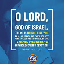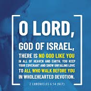 “Lord, the God of Israel, there is no God like you in heaven or on earth—you who keep your covenant of love with your servants who continue wholeheartedly in your way. 15 You have kept your promise to your servant David my father; with your mouth you have promised and with your hand you have fulfilled it—as it is today.