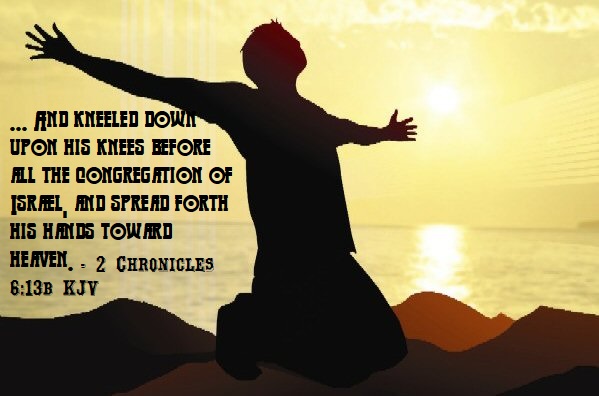 Solomon knelt on the special platform near the altar as he prayed, his hands lifted to heaven. Our traditional posture for prayer (“hands folded and eyes closed”) was unknown to the Jews. Their posture was to look up by faith toward God in heaven (or toward the temple) and lift their open hands to show their poverty and their expectancy as they awaited God’s answer (See Ex. 9:29, 33; Ps. 63:4; 88:9; 143:6). This practice was carried over into the early church (1 Timothy 2:8). Remember it is the heart that God sees as we posture ourselves in prayer.