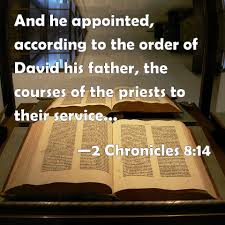 12 On the altar of the Lord that he had built in front of the portico, Solomon sacrificed burnt offerings to the Lord, 13 according to the daily requirement for offerings commanded by Moses for the Sabbaths, the New Moons and the three annual festivals—the Festival of Unleavened Bread, the Festival of Weeks and the Festival of Tabernacles. 14 In keeping with the ordinance of his father David, he appointed the divisions of the priests for their duties, and the Levites to lead the praise and to assist the priests according to each day’s requirement. He also appointed the gatekeepers by divisions for the various gates, because this was what David the man of God had ordered. 15 They did not deviate from the king’s commands to the priests or to the Levites in any matter, including that of the treasuries.