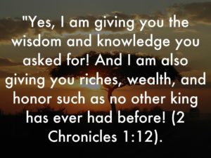 King Solomon’s name is synonymous with wisdom. He didn’t ask God to make him a great contractor and builder of the temple from the plans his father gave him. It wasn’t “make me rich enough to pay all my bills” as king. It wasn’t “let me live in peace.” It wasn’t “keep me fit physically” to do the king’s work. And it certainly wasn’t “help me to please all the people in my kingdom.” No—it was “Lord God, give me wisdom to rule over all the people you put in my care.” This plea was delivered with a heart humbled before God. This request pleased God so much that He gave Solomon extreme, Godly wisdom, wisdom beyond what the known world had ever heard or seen! Why? Because this was the first and only thing King Solomon asked of God as he came to the throne after his father King David. At that time, the young king had his father, King David’s heart for God.