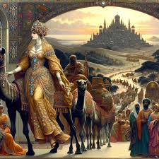 When the queen of Sheba heard of Solomon’s fame, she came to Jerusalem to test him with hard questions. Arriving with a very great caravan—with camels carrying spices, large quantities of gold, and precious stones—she came to Solomon and talked with him about all she had on her mind. 2 Solomon answered all her questions; nothing was too hard for him to explain to her. 3 When the queen of Sheba saw the wisdom of Solomon, as well as the palace he had built, 4 the food on his table, the seating of his officials, the attending servants in their robes, the cupbearers in their robes and the burnt offerings he made at the temple of the Lord, she was overwhelmed.