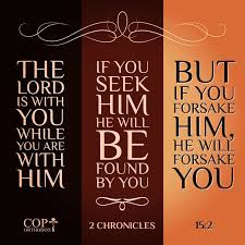 THE MESSAGE: “The Lord is with you when you are with him. If you seek him, he will be found by you, but if you forsake him, he will forsake you.