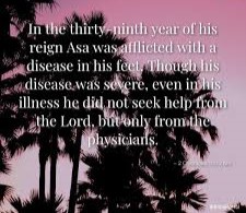 11 The events of Asa’s reign, from beginning to end, are written in the book of the kings of Judah and Israel. 12 In the thirty-ninth year of his reign Asa was afflicted with a disease in his feet. Though his disease was severe, even in his illness he did not seek help from the Lord, but only from the physicians. 13 Then in the forty-first year of his reign Asa died and rested with his ancestors. 14 They buried him in the tomb that he had cut out for himself in the City of David. They laid him on a bier covered with spices and various blended perfumes, and they made a huge fire in his honor.