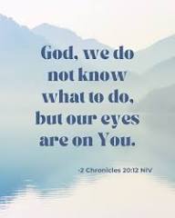 “We do not know what to do, but our eyes are on you.” This is exactly what we should do in every battle for all battles from the enemy who seeks to distract and deceive us by presenting skirmishes meant to defeat us and destroy our faith truly belong to the Lord who has already won! We must look up for the foolishness and put our eyes on Jesus, our Advocate before the Father, who has already won the war!