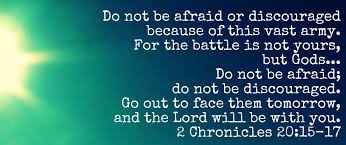 15 He said: “Listen, King Jehoshaphat and all who live in Judah and Jerusalem! This is what the Lord says to you: ‘Do not be afraid or discouraged because of this vast army. For the battle is not yours, but God’s. 16 Tomorrow march down against them. They will be climbing up by the Pass of Ziz, and you will find them at the end of the gorge in the Desert of Jeruel. 17 You will not have to fight this battle. Take up your positions; stand firm and see the deliverance the Lord will give you, Judah and Jerusalem. Do not be afraid; do not be discouraged. Go out to face them tomorrow, and the Lord will be with you.’”
