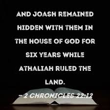 10 When Athaliah the mother of Ahaziah saw that her son was dead, she proceeded to destroy the whole royal family of the house of Judah. 11 But Jehosheba, the daughter of King Jehoram, took Joash son of Ahaziah and stole him away from among the royal princes who were about to be murdered and put him and his nurse in a bedroom. Because Jehosheba, the daughter of King Jehoram and wife of the priest Jehoiada, was Ahaziah’s sister, she hid the child from Athaliah so she could not kill him. 12 He remained hidden with them at the temple of God for six years while Athaliah ruled the land.