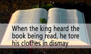 19 When the king heard the words of the Law, he tore his robes. 20 He gave these orders to Hilkiah, Ahikam son of Shaphan, Abdon son of Micah, Shaphan the secretary and Asaiah the king’s attendant: 21 “Go and inquire of the Lord for me and for the remnant in Israel and Judah about what is written in this book that has been found. Great is the Lord’s anger that is poured out on us because those who have gone before us have not kept the word of the Lord; they have not acted in accordance with all that is written in this book.”