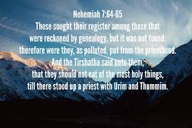 64 These searched for their family records, but they could not find them and so were excluded from the priesthood as unclean. 65 The governor, therefore, ordered them not to eat any of the most sacred food until there should be a priest ministering with the Urim and Thummim.