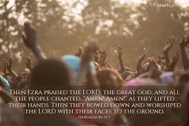 5 Ezra opened the book. All the people could see him because he was standing above them; and as he opened it, the people all stood up. 6 Ezra praised the Lord, the great God; and all the people lifted their hands and responded, “Amen! Amen!” Then they bowed down and worshiped the Lord with their faces to the ground.