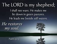 Psalm 23, the wonderful testimony of God by David who knew what it was like to shepherd sheep who relied on him for food and water, has become one of the most quoted psalms of the Bible. It is read at funerals most often as a testimony of God in the believer who has gone to live with the Shepherd forever. Knowing all that however, I wonder if this shouldn’t be read as our “daily manna” of food for the soul until we truly internalize the fact that God/Jesus/Holy Spirit is indeed our personal Shepherd who leads each one of us and collectively as His “church of sheep” to all that is Good and right for us? For example;