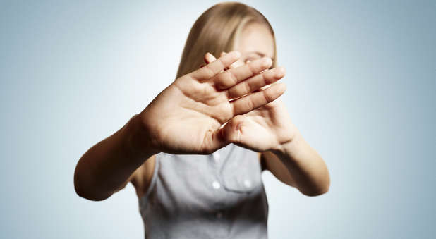 Closeup portrait distrust young portrait of blonde woman which closes hand from the camera and doesn’t want to be photographed at isolated blue background. Negative emotions, facial expression